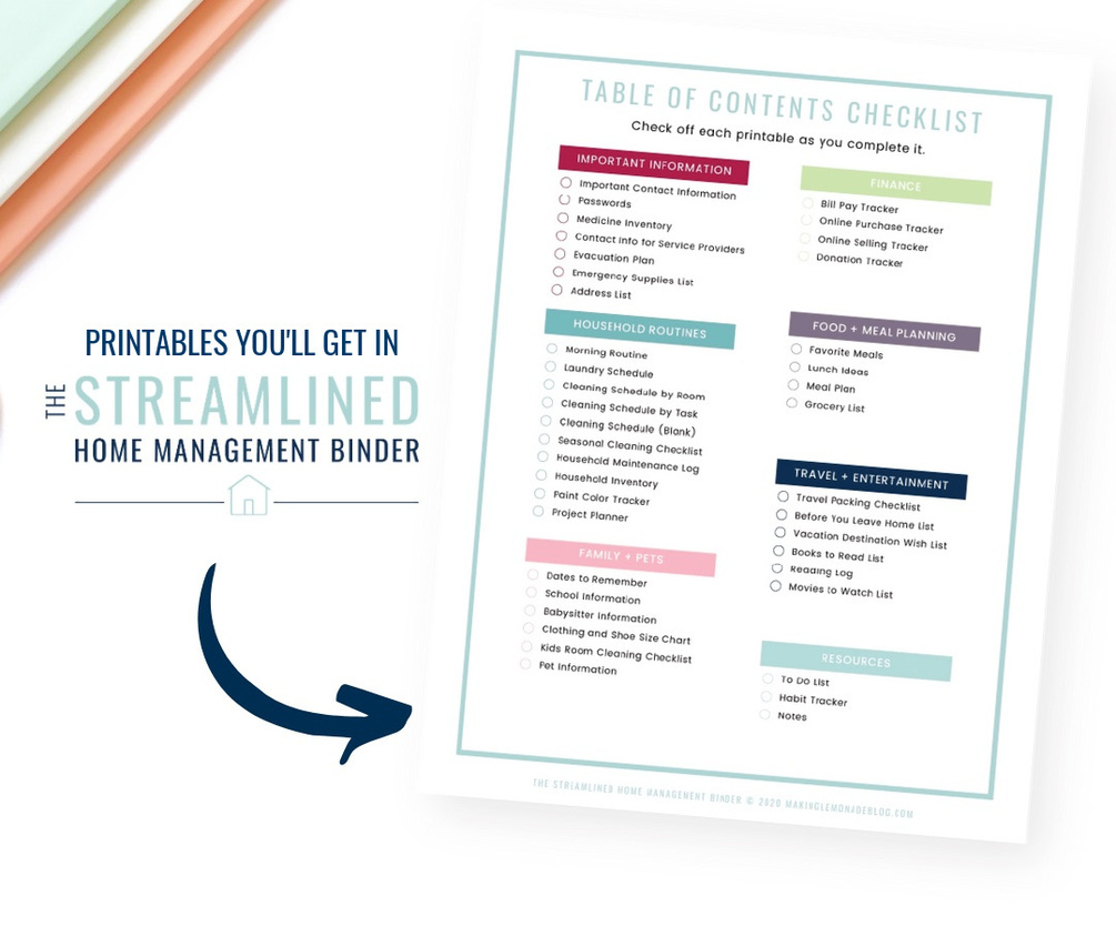 The Streamlined Home Management Binder organizes all aspects of running a smooth and organized home and life. You'll get a .pdf with color-coordinated printables to make a complete home management binder, arranged in actionable steps, so you can create more time to do what you love.